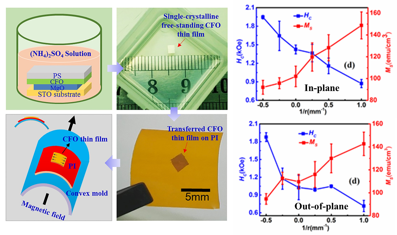 近年来,基于应力对铁磁或铁电材料物理性质调控的研究越来越引起全世界范围的广泛关注。应力不仅可以改变超导和铁电材料的居里温度,而且这种应力调控在多铁耦合和各种传感器等研究方向有巨大的应用前景。然而,外延应力受到基片晶格常数、薄膜与基片界面效应,还有薄膜自身不同厚度导致应变弛豫的影响,在对单一薄膜样品连续应力调控方面面临较大的挑战,而且不利于精准分析应力与薄膜物性的关系。 近日,西安交通大学贾春林科学家工作室刘明副教授指导的博士生张永和沈律康利用湿法化学转移技术制备大尺度无支撑单晶CoFe2O4薄膜,并成功转移到柔性的聚酰亚胺和硅等衬底上。通过改变柔性的聚酰亚胺衬底的弯曲半径,实现对柔性衬底上单晶CoFe2O4薄膜应力连续调控,从而调控薄膜的磁学特性。研究表明,利用这种方法转移的薄膜能较好保持其原位生长时的结构和磁学特性,并且通过这种外界施加机械应力能在较大范围内连续改变CoFe2O4薄膜的矫顽场和饱和磁化。通过对薄膜面内和面外磁性变化比较,说明应力对CoFe2O4薄膜磁各向异性的影响和调控。该项研究结果不仅对无支撑单晶薄膜基础研究提供可能,而且在柔性电子学领域提供更大的研究空间。