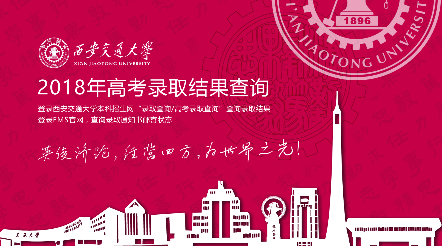 亲爱的同学们: 2018年高考录取已经陆续开始,根据各省教育考试院或招生办录取日程安排,我们正在进行录取。 为方便大家及时获知录取结果,我们将在西安交通大学本科招生网提供录取结果查询服务。请登录西安交通大学本科招生网,点击“录取查询/高考录取查询”,输入姓名、考生号、身份证号即可查询。(注:考生号为18开头的14位数字) 录取结束后我们将尽快寄出录取通知书。今年我们继续和EMS合作,大家可登录EMS官网,点击“高考录取通知书查询”,输入14位考生号跟踪录取通知书邮寄状态。为方便通知书投递,请大家保持高考报名时所填的联系手机畅通。 无论是否录取到交大,希望每一位同学都能继续坚信自己的优秀与出色。进入理想的大学当然重要,但并不完全决定你的人生。生命无限丰富的可能性等待你去创造和体验! 当然,我们仍要对被录取到交大的同学表示最衷心祝贺和最诚挚的欢迎。你们是交大新的力量,交大的未来由你们创造! 新的xjtuer,我们8月18-19日兴庆湖畔见! 截至今日(7月10日),已完成录取的项目有: 提前批: 山西理工、文史 山东理工 江苏文史 内蒙古理工 江西理工 吉林理工、文史 甘肃理工 青海理工、文史 宁夏理工 福建文史 安徽文史 四川理工、文史 广东文史 广西理工、文史 黑龙江理工、文史 贵州理工、文史 河北理工、文史 河南理工、文史